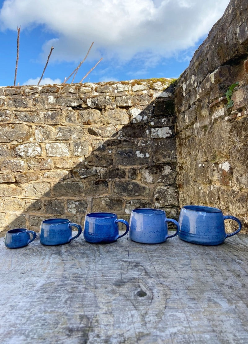 These beautifully shaped mugs have an inky blue glaze. Each mug is unique. Choose from this full range of sizes: